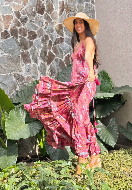 Pink Bliss Bohemian Dress | Ruched Waist Silk Midi Dress | Beachwear Singapore