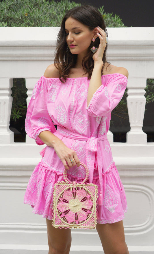 Romantic Sunset Off Shoulder Dress | Pink Bohemian Dress | Beachwear Singapore