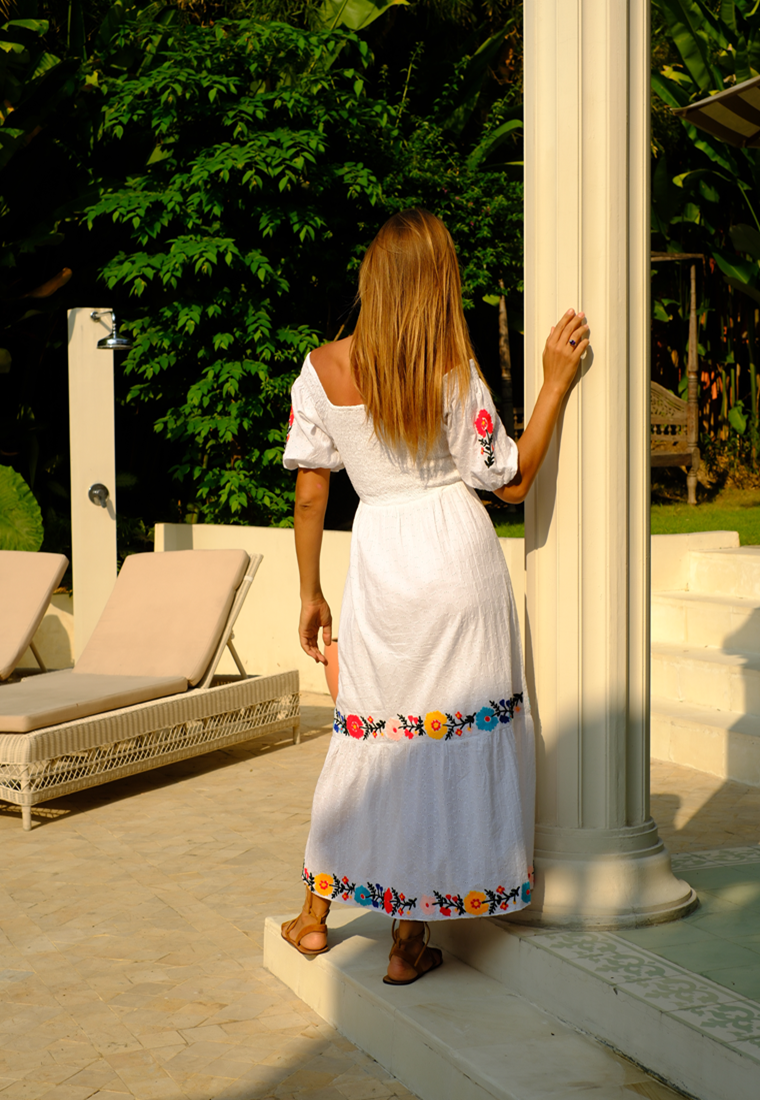 Delicate yet vibrant, the hand-embroidered floral details along the hemline and sleeves add a striking pop of color in shades of red, yellow, blue, and orange. This eye-catching design makes it the perfect resort wear dress for tropical getaways, maxi dress for garden parties, or stylish option for casual beach strolls.